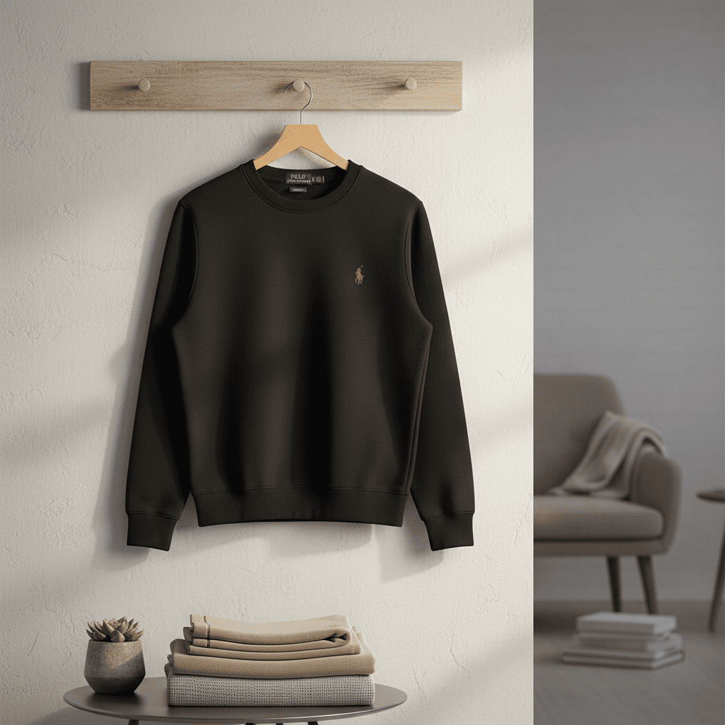 Ralph Lauren Polo black crewneck sweatshirt, soft cotton fabric, red pony logo on chest, unisex casual American style, warm and versatile for everyday wear.