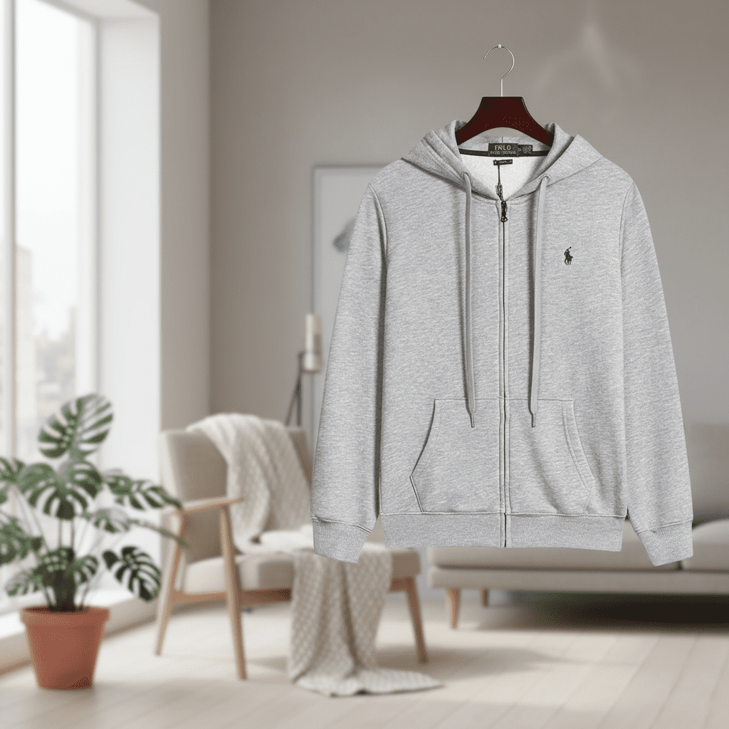 Ralph Lauren POLO light gray zip-up hoodie, soft cotton fabric, adjustable drawstring hood, front kangaroo pocket, iconic chest logo, unisex casual style for comfortable everyday wear.