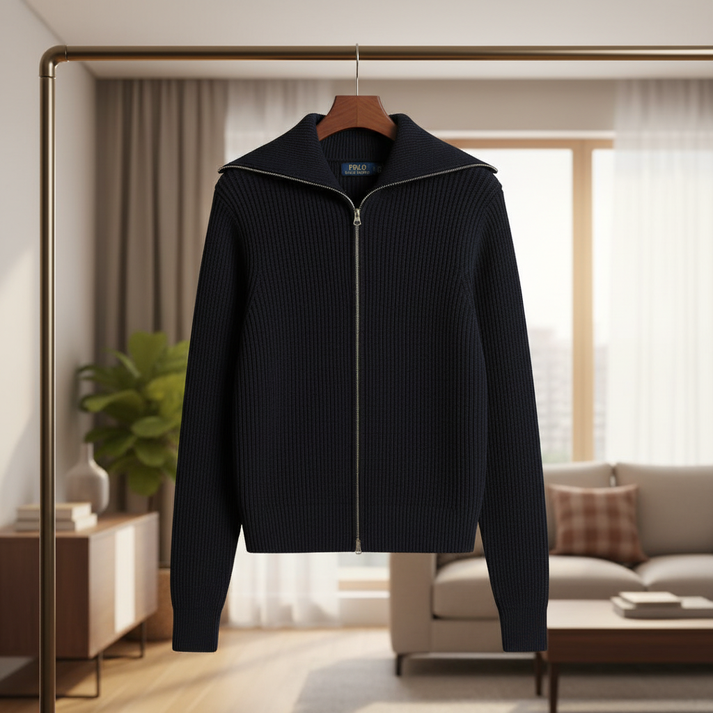 Ralph Lauren POLO Navy Knit Zip Cardigan – premium fabric, classic collar with silver zipper, timeless American casual style, unisex, warm and comfortable, showcasing effortless elegance.