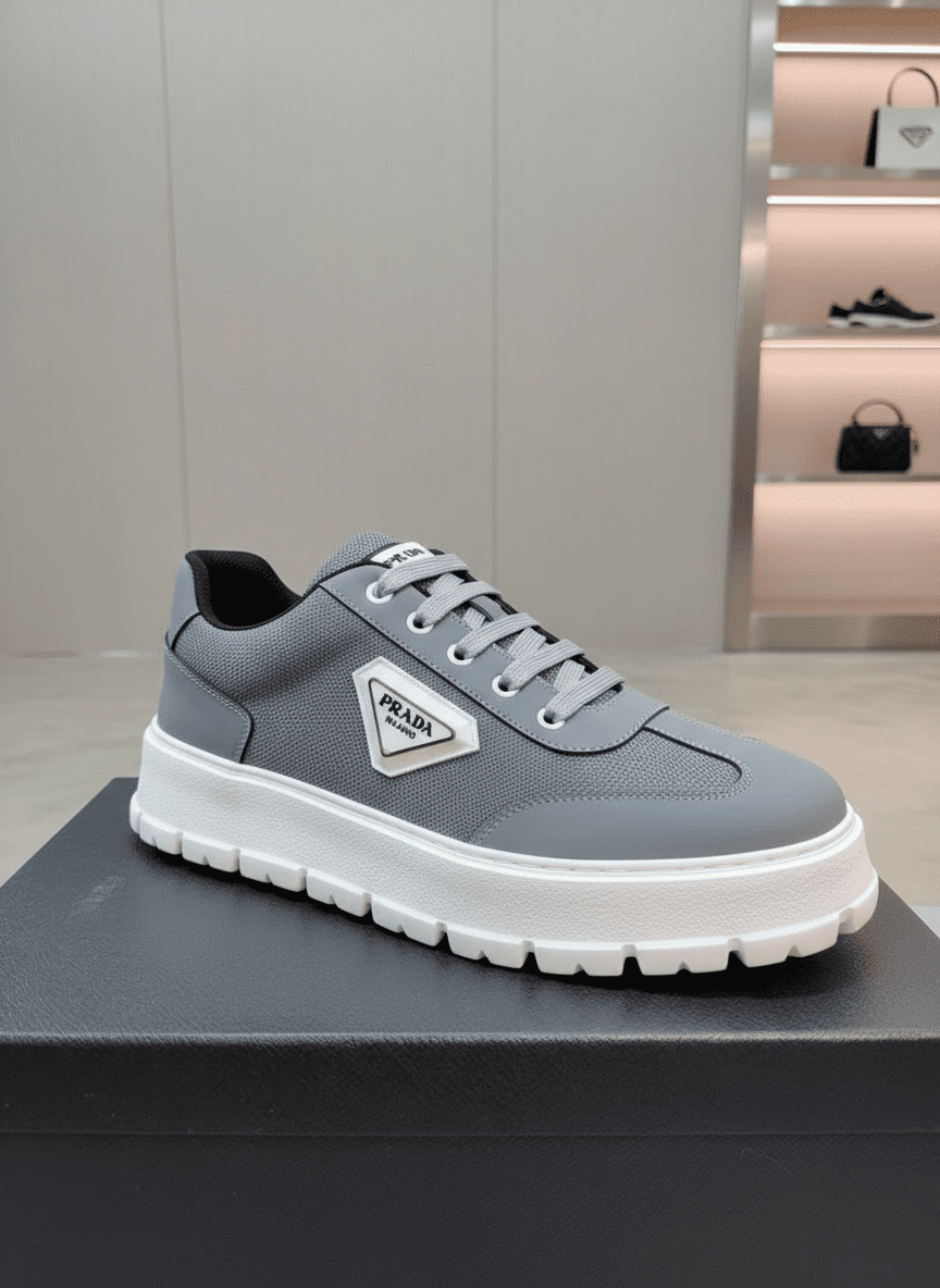 Prada Leather Knit Sneakers Brogue Craftsmanship Unisex Silver Gray White