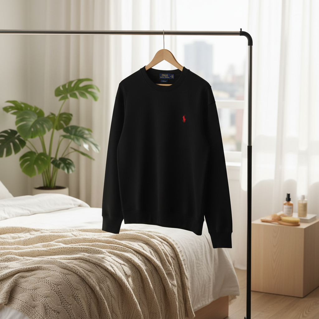 Ralph Lauren Polo black crewneck sweatshirt, made of premium soft breathable cotton, features red pony logo on chest, unisex design, American casual style, perfect for everyday wear.