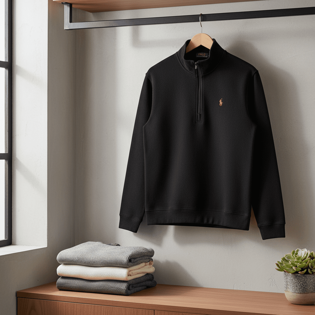 Ralph Lauren Polo Black Half-Zip Sweatshirt – premium cotton, stand collar, red pony logo, classic American casual style, unisex, warm and comfortable for elegant everyday wear.