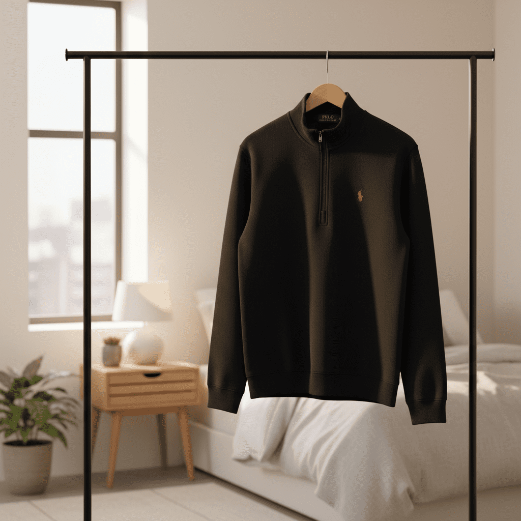 Ralph Lauren POLO Black Half-Zip Cotton Sweatshirt featuring soft warm fabric, iconic red pony embroidery on chest, classic American casual style, unisex design for comfortable daily wear.