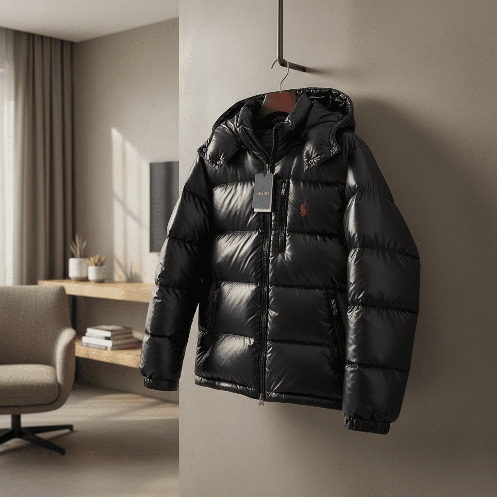 Ralph Lauren Black Glossy Hooded Down Jacket, warm and comfortable with classic quilted design, adjustable hood, red pony logo, unisex casual American style for daily and outdoor wear.