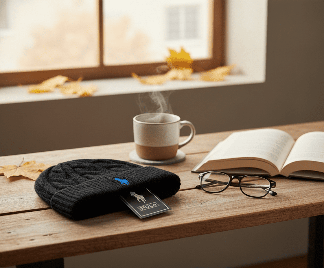 Ralph Lauren Classic Black Knit Beanie, crafted from soft fabric with cable-knit design, features iconic polo logo, unisex casual style, warm and comfortable for elegant everyday wear.