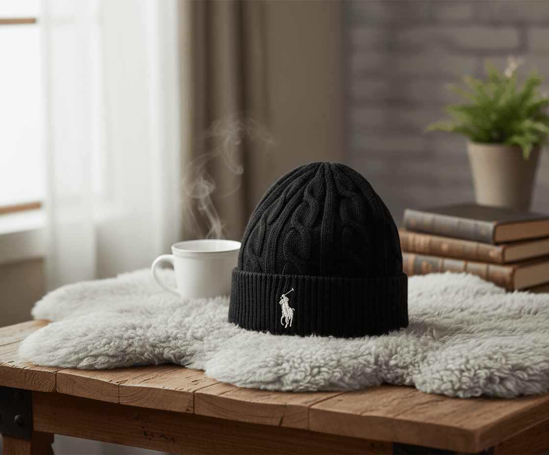 Ralph Lauren Classic Black Knit Beanie, warm cable-knit fabric, iconic Polo logo detail, timeless casual style, unisex design, cozy and elegant winter accessory.