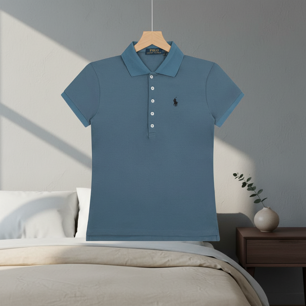 Ralph Lauren Women’s Lake Blue Polo Shirt, made of premium breathable cotton, features a classic polo collar with button placket and signature pony logo, perfect for casual or daily wear.