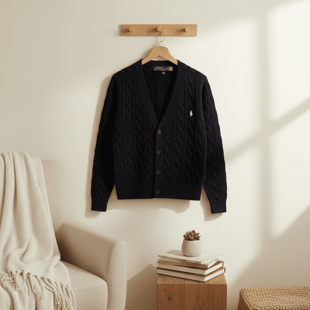 Ralph Lauren black V-neck cable knit cardigan, soft warm fabric, iconic Polo logo on chest, button closure, unisex design, American casual style for daily or smart casual wear.