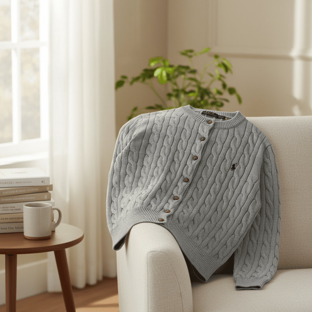 Ralph Lauren Polo Gray Cable Knit Cardigan, classic crew neck button design, signature pony logo, soft cozy unisex style for casual wear, perfect for daily comfort and timeless American fashion.