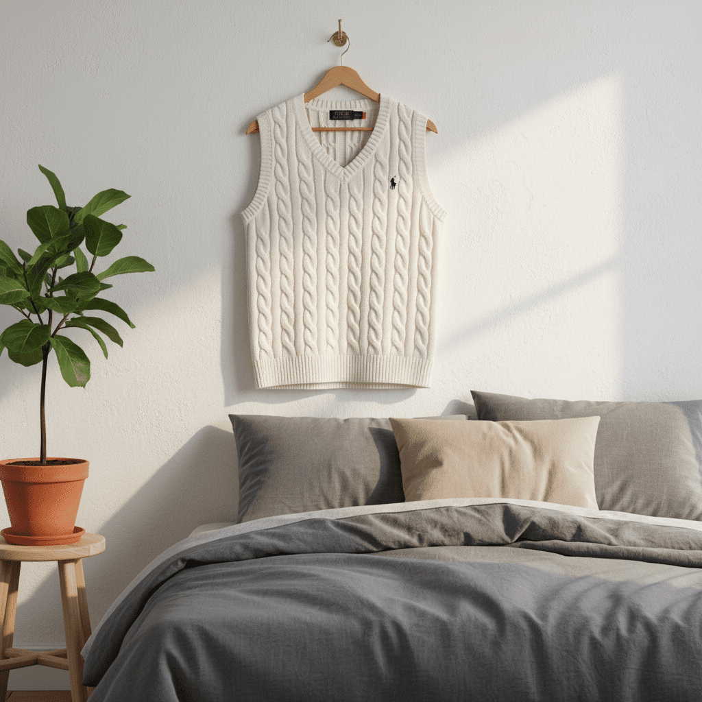 Ralph Lauren Polo white knitted vest, crafted from soft fabric with classic cable V-neck design, signature pony logo, unisex American casual style, perfect for daily wear or relaxed occasions.