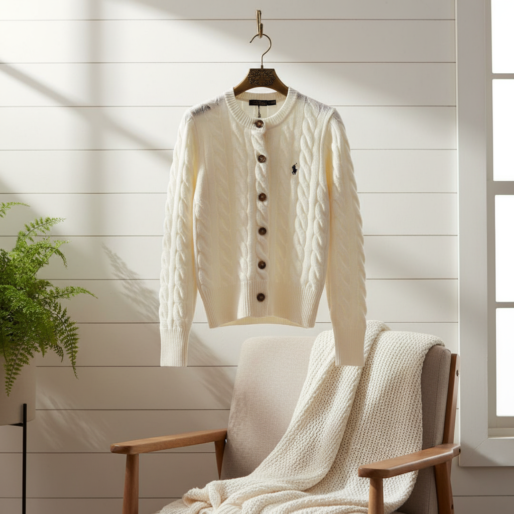 Ralph Lauren Classic White Cable Knit Cardigan, premium fabric with cozy texture, brown button closure, iconic pony logo, gender-neutral design for timeless American casual style.