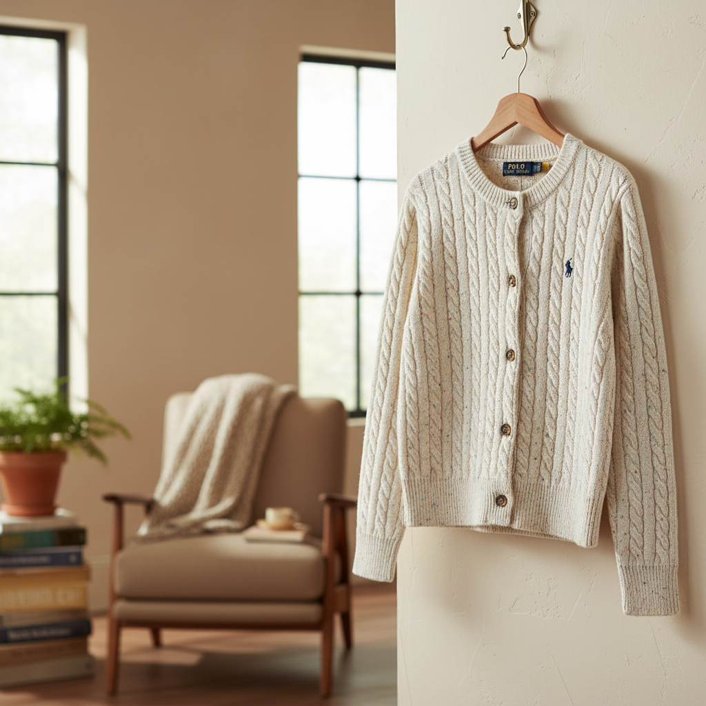 Ralph Lauren Polo cream cable knit cardigan, soft cozy fabric, round neck button front, iconic pony logo on chest, unisex design for daily casual or office wear, classic American style.