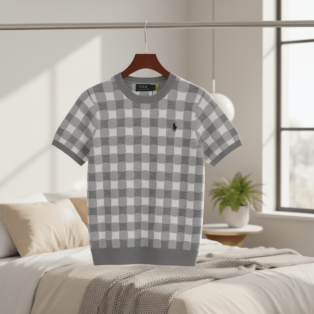 Ralph Lauren Polo Gray White Checkered Knit Short Sleeve Top, soft knit fabric, crew neck, classic pony logo on chest, unisex casual style for an elegant and relaxed everyday look.