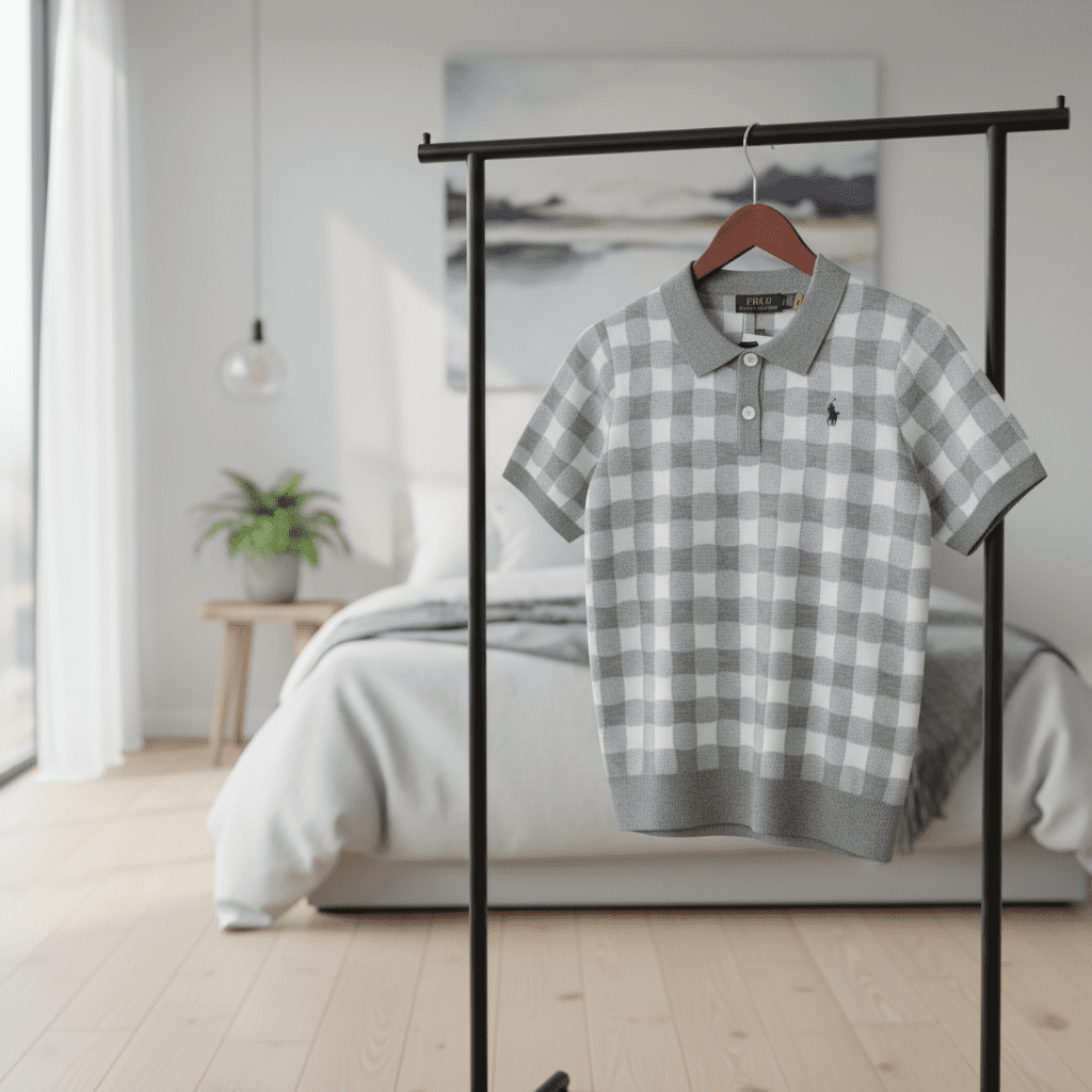 Ralph Lauren Classic Polo Gray White Check Short Sleeve Shirt, soft knit fabric, iconic pony logo, unisex design, breathable comfort for daily commute or casual wear.
