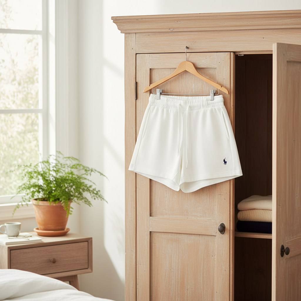 Ralph Lauren white casual shorts crafted from breathable fabric with drawstring elastic waist, iconic pony embroidery, unisex design, perfect for daily wear, offering classic American casual elegance.