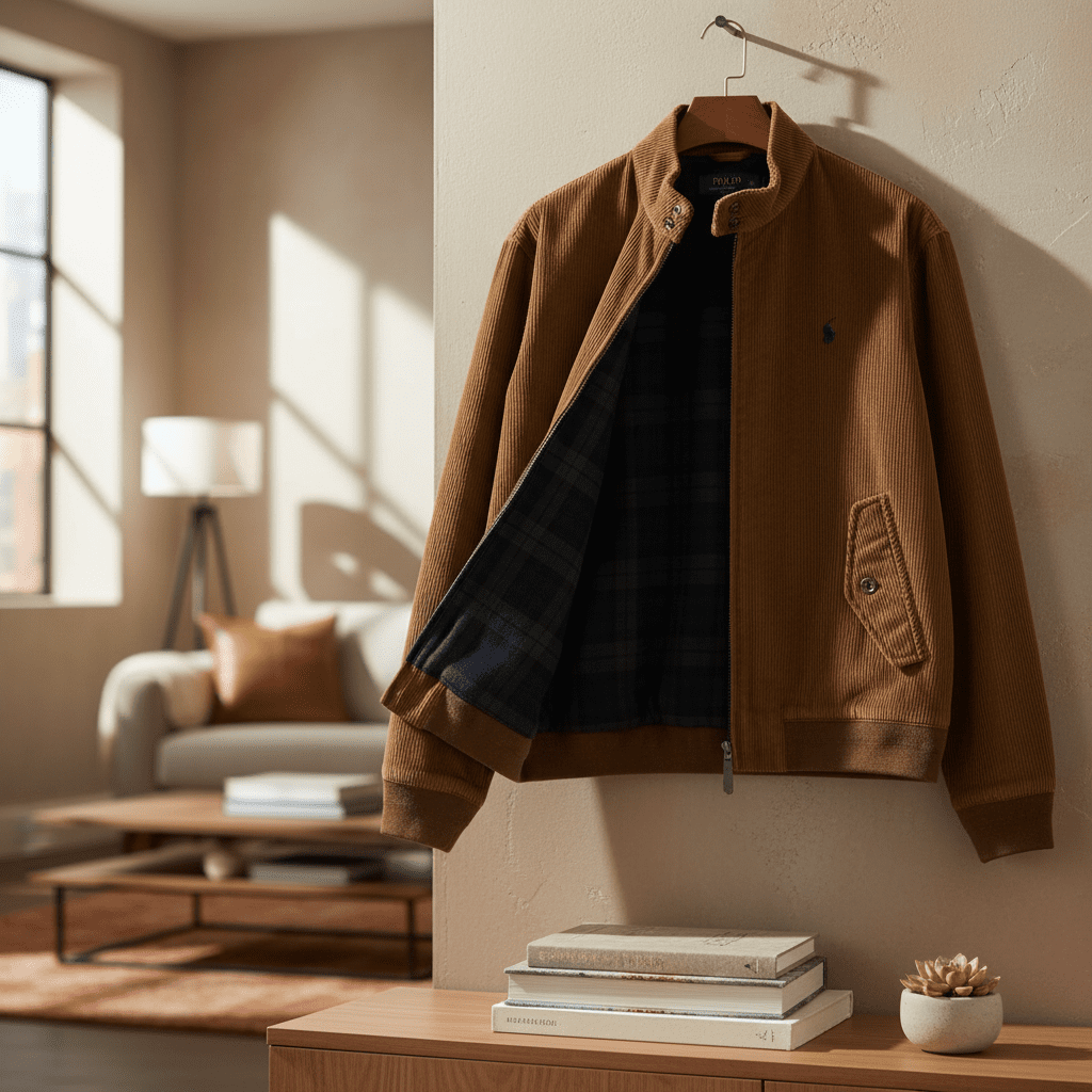 Ralph Lauren Khaki Corduroy Jacket, soft and warm premium fabric, stand collar zip design with plaid lining, iconic pony logo, button pockets, unisex casual American style for daily wear.