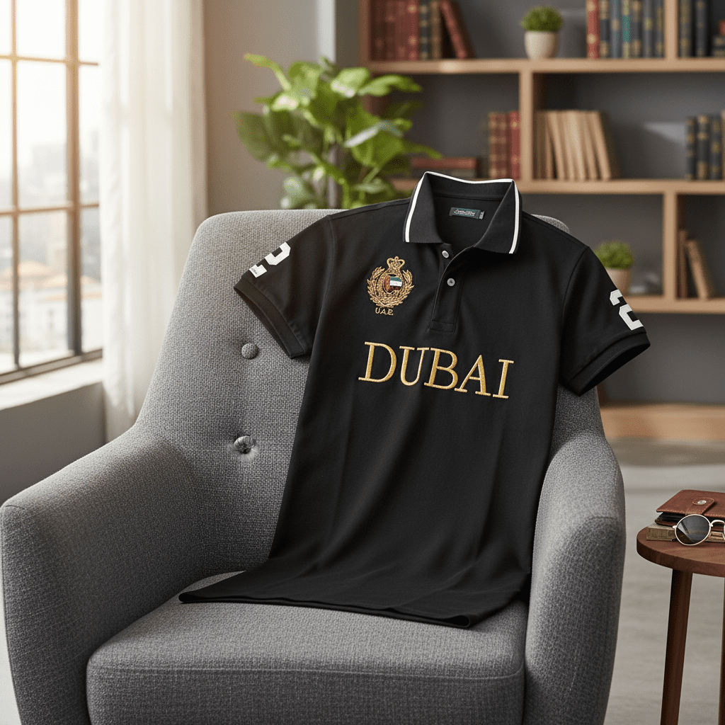 Ralph Lauren Black Business Casual Polo Shirt, premium cotton, breathable comfort, gold Dubai emblem and crest, number 2 on sleeve, classic collar, unisex design, perfect for daily work or leisure.