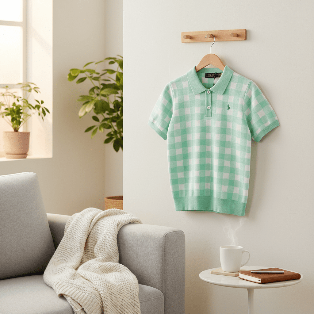 Ralph Lauren Polo Mint Green Check Knit Polo Shirt with classic collar and pony logo, breathable and comfy, unisex casual wear showcasing iconic American style.