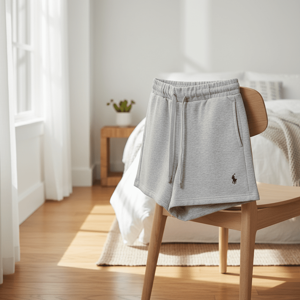 Ralph Lauren Classic Series Light Gray Cotton Shorts, soft breathable fabric with elastic drawstring waist, Polo logo embroidery, unisex casual wear, versatile American style for everyday comfort.
