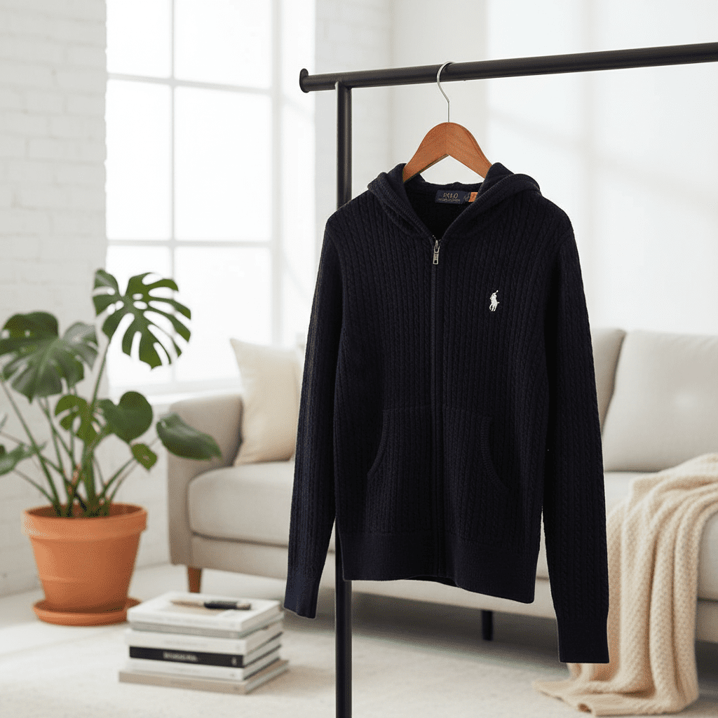 Ralph Lauren Polo black knit zip hoodie with cable pattern and iconic pony logo, warm and comfortable unisex design, perfect for casual American style and everyday wear.
