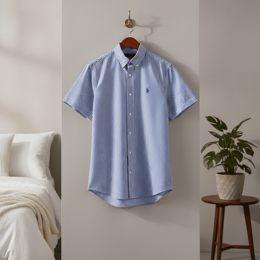 Ralph Lauren Polo blue and white striped cotton short-sleeve shirt, breathable, button-down collar, classic pony logo, unisex design for casual or office wear, timeless American elegance.