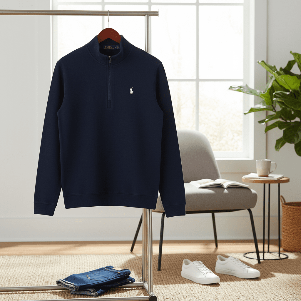 Ralph Lauren POLO navy half-zip mock neck sweatshirt, made from premium breathable cotton, features a signature white pony logo on chest, unisex design for timeless casual elegance.