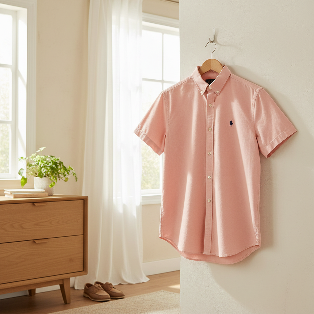 Ralph Lauren Classic Pink Short Sleeve Shirt – breathable cotton fabric, button-down collar, signature pony logo on chest, timeless American casual style for men and women.