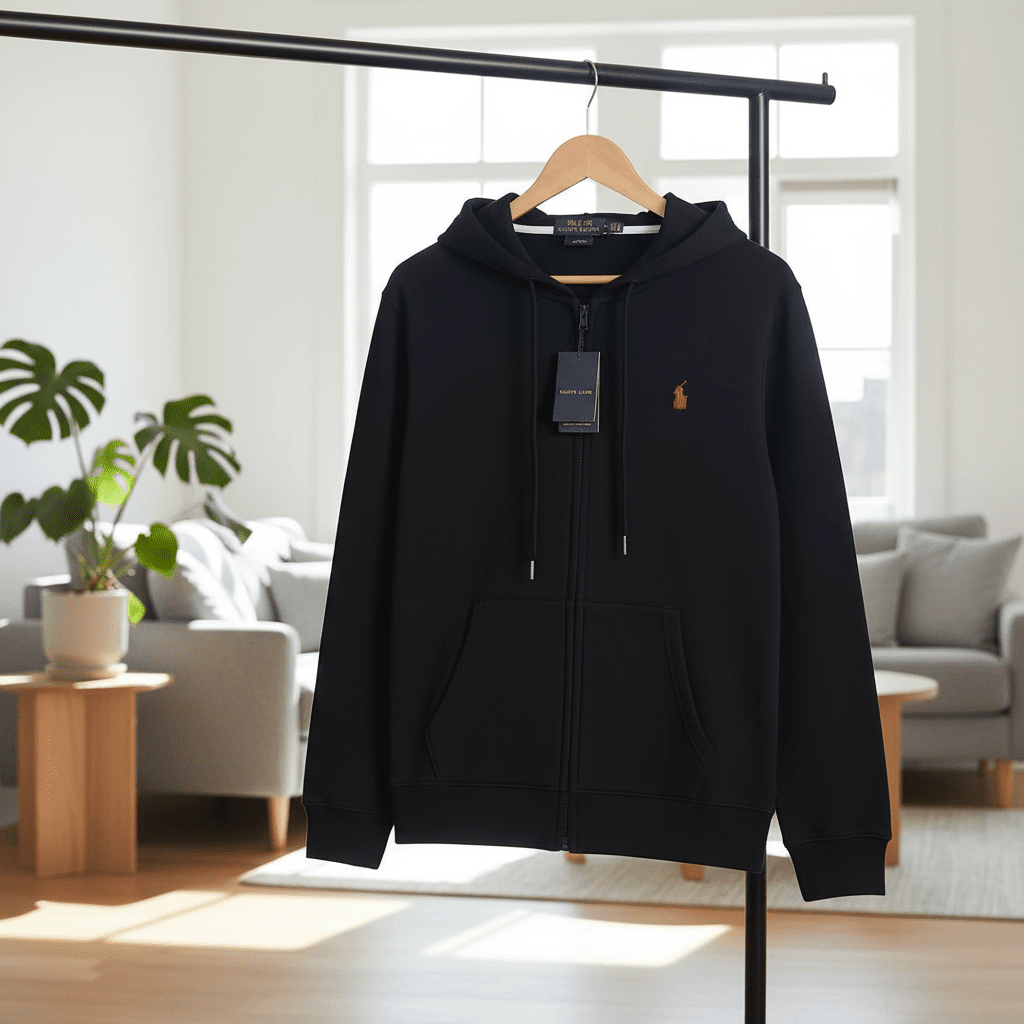 Ralph Lauren Classic Black Zip-Up Hoodie, soft premium cotton, red pony logo on chest, kangaroo pockets, unisex American casual style, comfy daily wear with minimalist elegance.