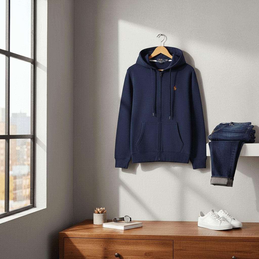 Ralph Lauren classic navy zip-up hoodie made of soft breathable cotton, features red pony logo on chest, adjustable drawstring hood, front kangaroo pocket, unisex casual American style.