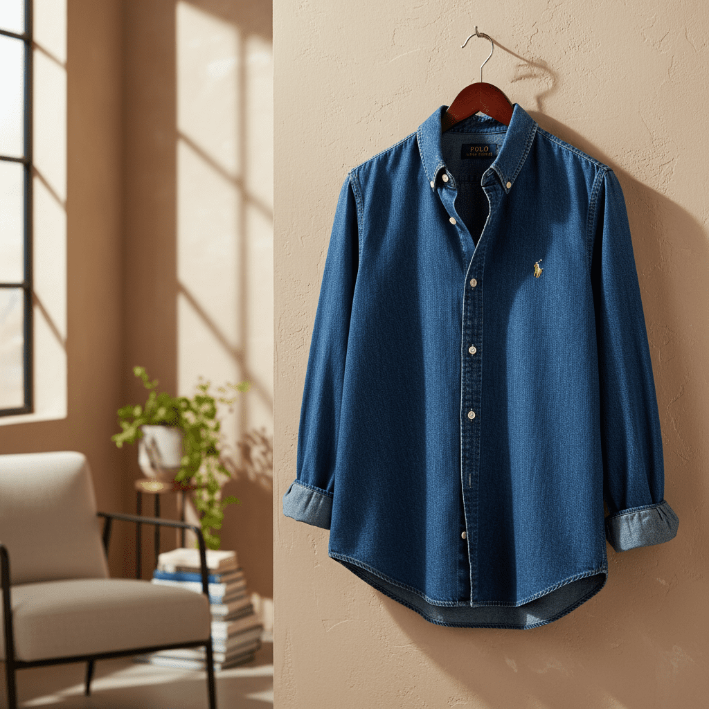 Ralph Lauren Classic Denim Shirt: Deep blue long-sleeve button-up with signature pony logo, premium denim fabric, timeless American casual style, unisex fit, perfect for everyday comfort and versatility.