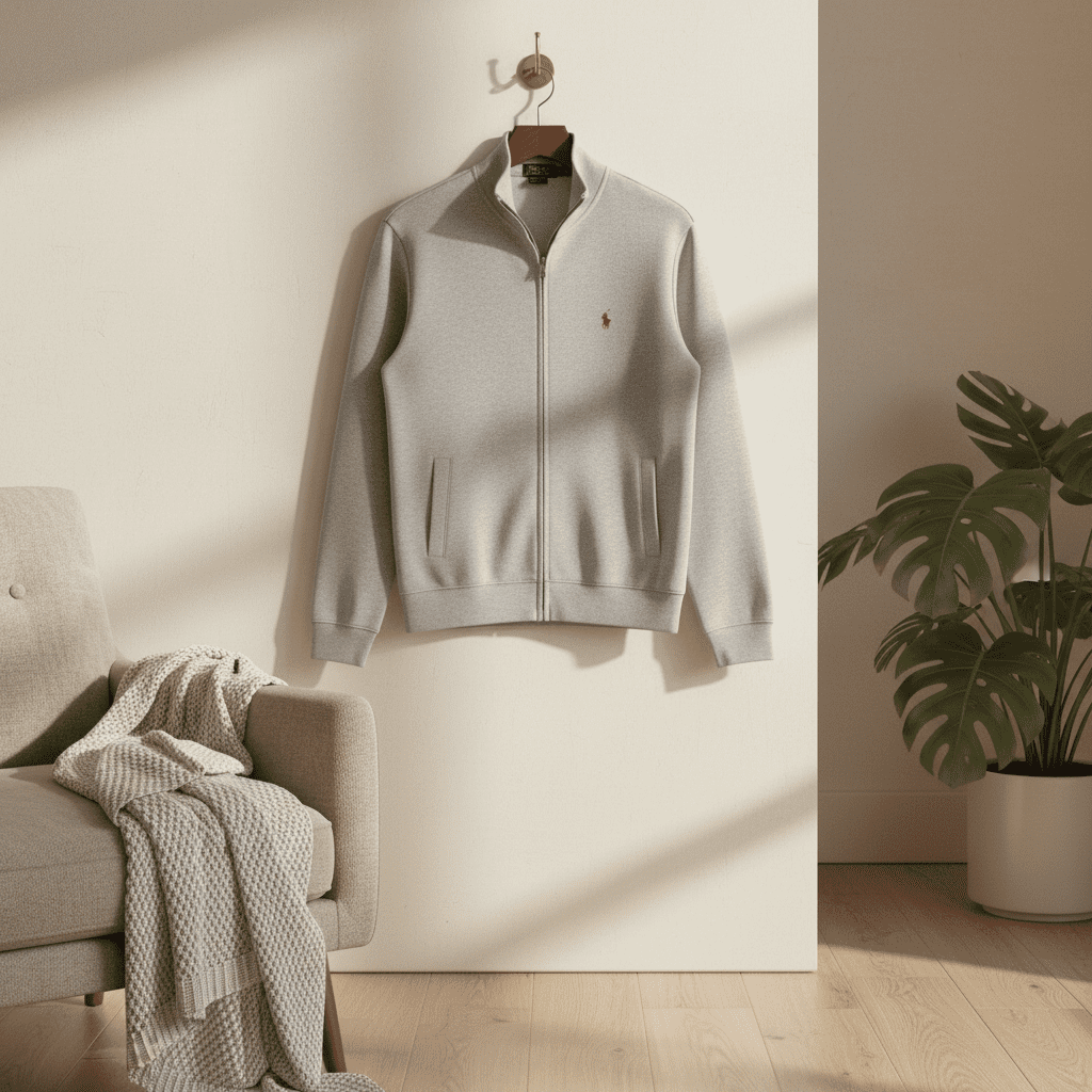 Ralph Lauren Polo Light Gray Zip Sweatshirt Jacket, soft cotton-blend fabric, stand collar, full-zip front, side pockets, classic American casual style, unisex for everyday warmth and comfort.