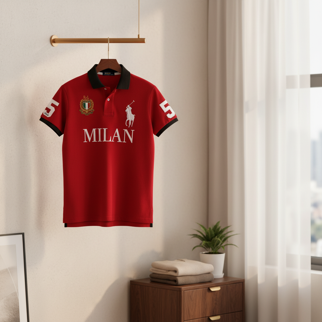 Ralph Lauren Red Milan Polo Shirt, soft breathable cotton, white MILAN print and polo logo, Italian flag collar, number 55 sleeve, classic unisex casual style, perfect for everyday wear.
