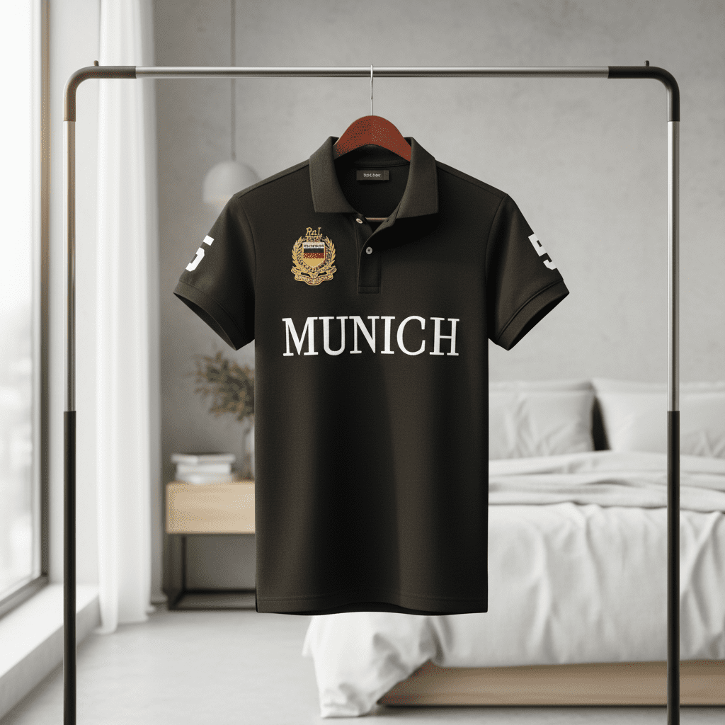 Ralph Lauren Munich Series Black Polo Shirt, premium cotton, white “MUNICH” print with crest, sleeve number detail, classic collar, sporty casual style, unisex, perfect for daily wear.
