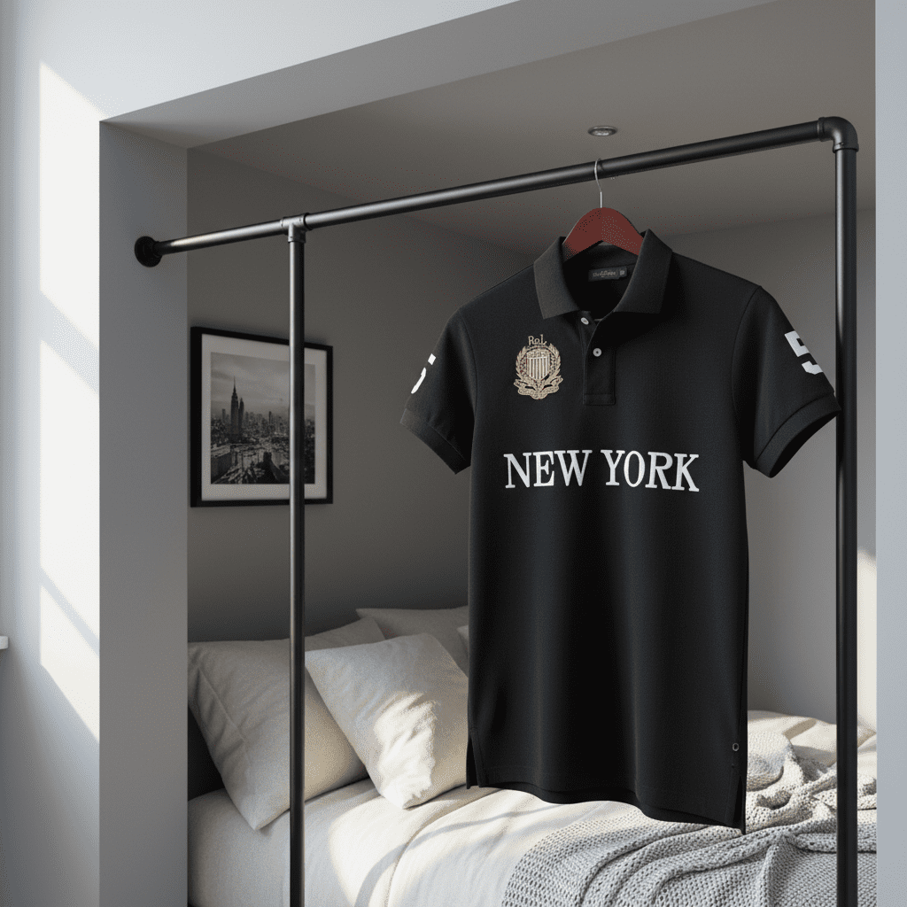 Ralph Lauren Black Polo Shirt featuring white “NEW YORK” print and gold crest logo, made from premium breathable cotton, unisex short-sleeve design, classic American casual style for everyday wear.