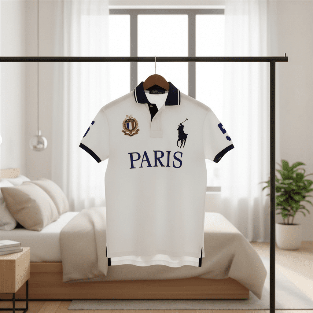 Ralph Lauren Paris Collection White Polo Shirt, premium breathable cotton, navy-trimmed collar and sleeves, PARIS lettering, polo emblem and crest, classic American casual unisex style.
