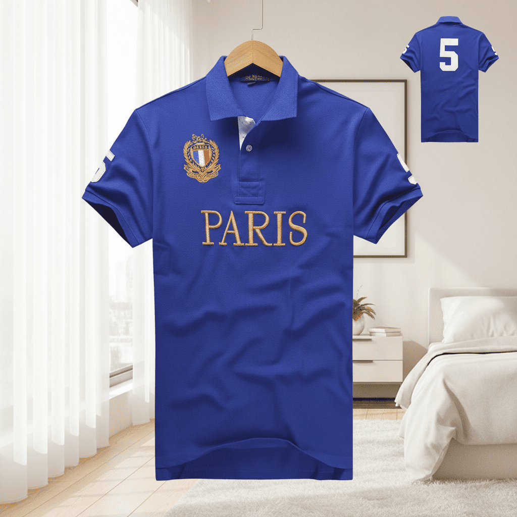 Ralph Lauren Classic Blue Polo Shirt, soft breathable cotton, gold PARIS logo with crest, number 5 design on back, unisex American casual style, perfect for daily wear with timeless fashion.