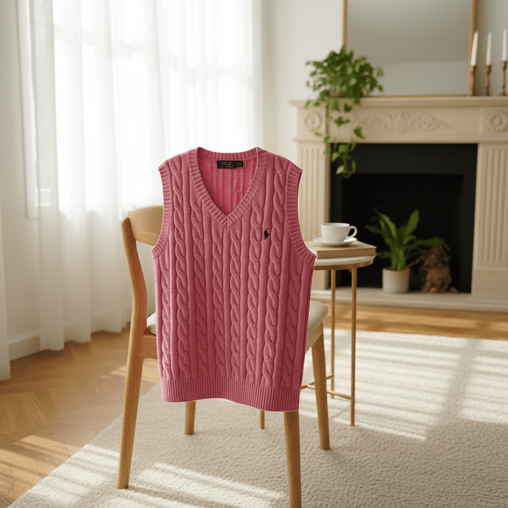 Ralph Lauren Pink Cable Knit Vest, soft knit fabric, V-neck sleeveless design, iconic pony logo on chest, cozy and stylish unisex piece for layering or standalone wear.