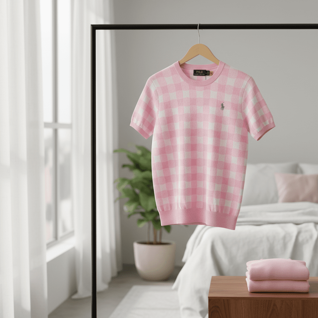 Ralph Lauren Polo pink and white checkered short-sleeve knit shirt, soft breathable fabric, classic round neck, signature pony logo, unisex design, stylish American casual look.