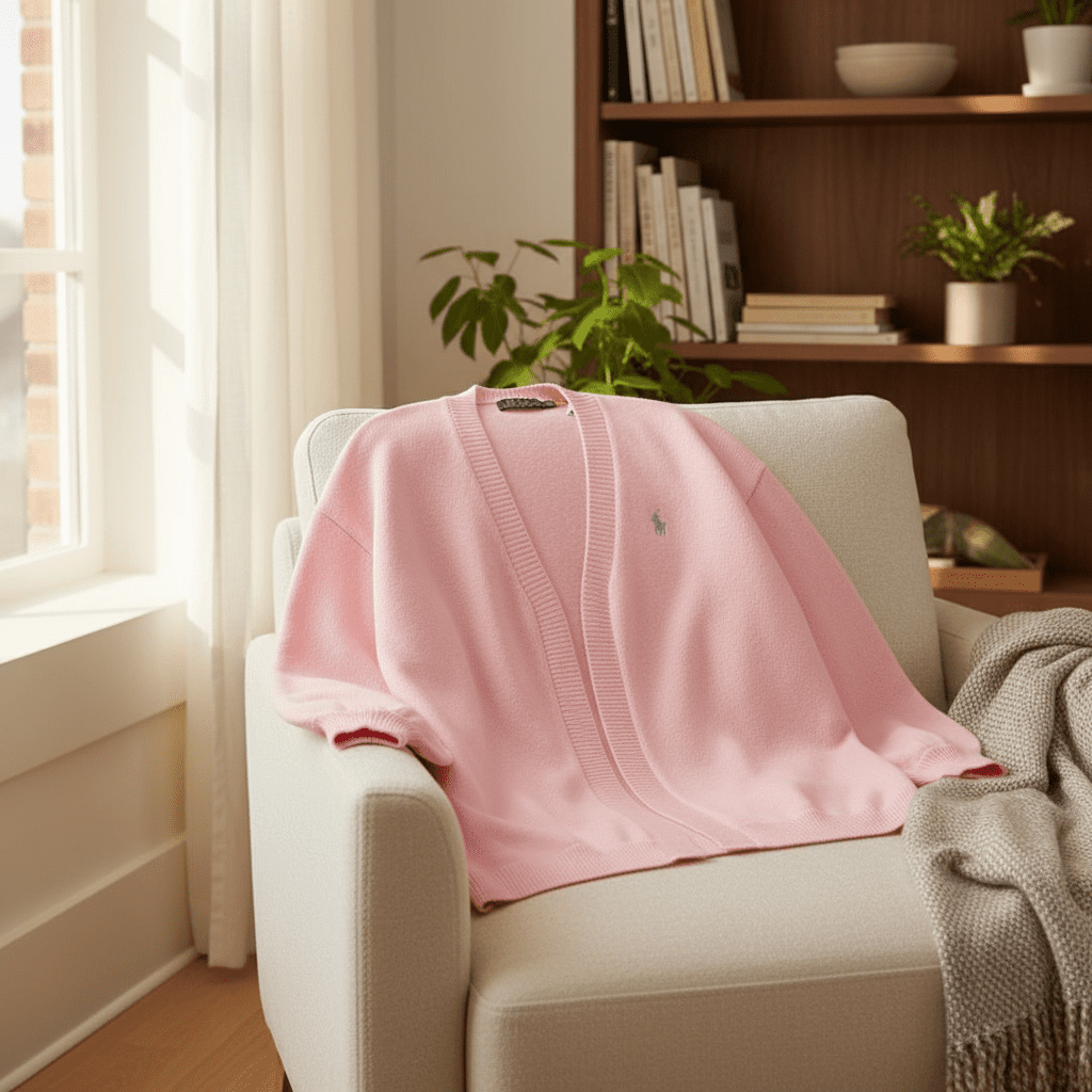 Ralph Lauren Pink Knit Cardigan, soft fabric with V-neck design, signature pony logo on chest, unisex American casual style, warm and comfy for daily commute or leisure wear.