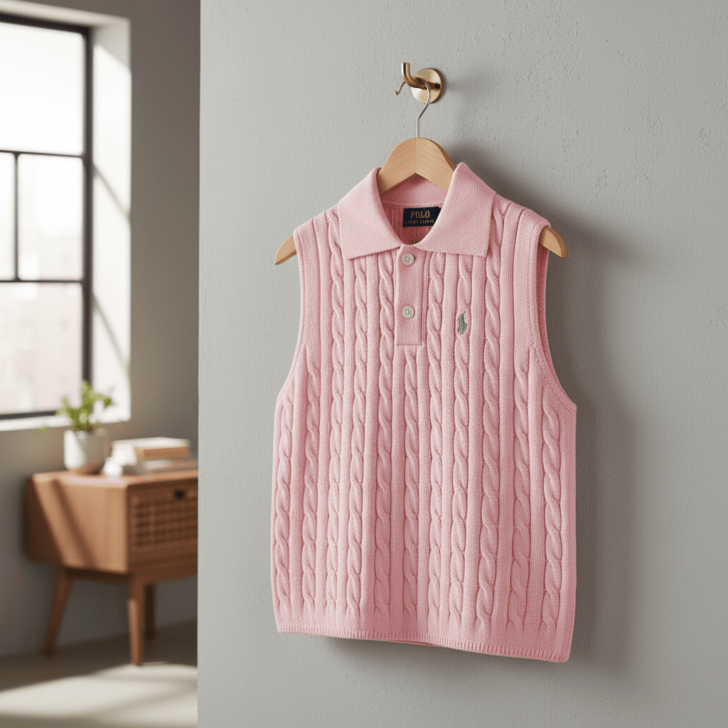 Ralph Lauren Pink Sleeveless Cable Knit Polo Vest featuring signature pony logo, classic American casual style and minimalist design, perfect for everyday wear and layered outfits.