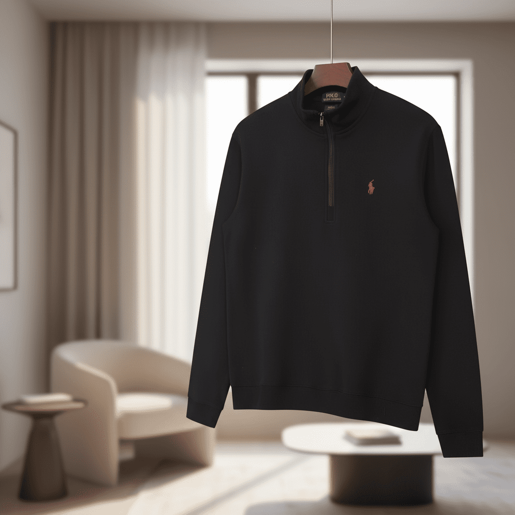 Ralph Lauren Polo black half-zip sweatshirt, soft premium cotton, stand collar for easy wear, red pony logo on chest, classic American casual unisex style perfect for daily commute or leisure.