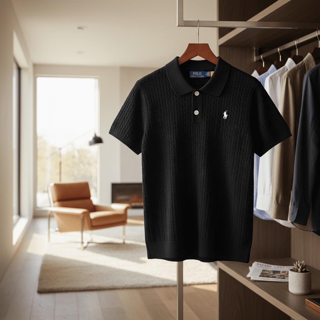 Ralph Lauren Polo Black Knit Polo Shirt, breathable and comfortable, with double-button collar and white pony logo on chest, unisex modern classic style for effortless American casual elegance.