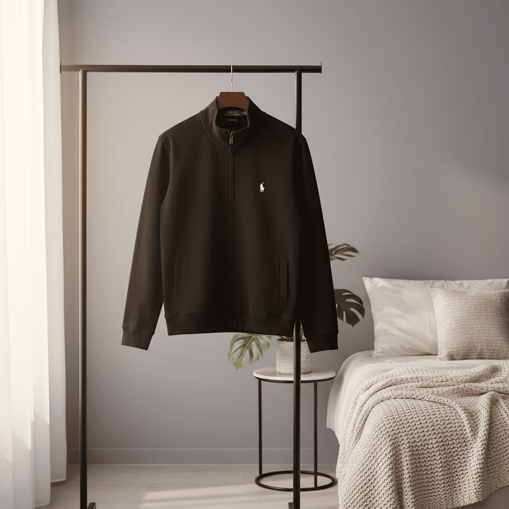 Ralph Lauren Polo black stand-collar zip jacket, crafted from soft knit fabric, features iconic white pony logo, warm windproof design, side pockets, unisex style for comfortable everyday wear.
