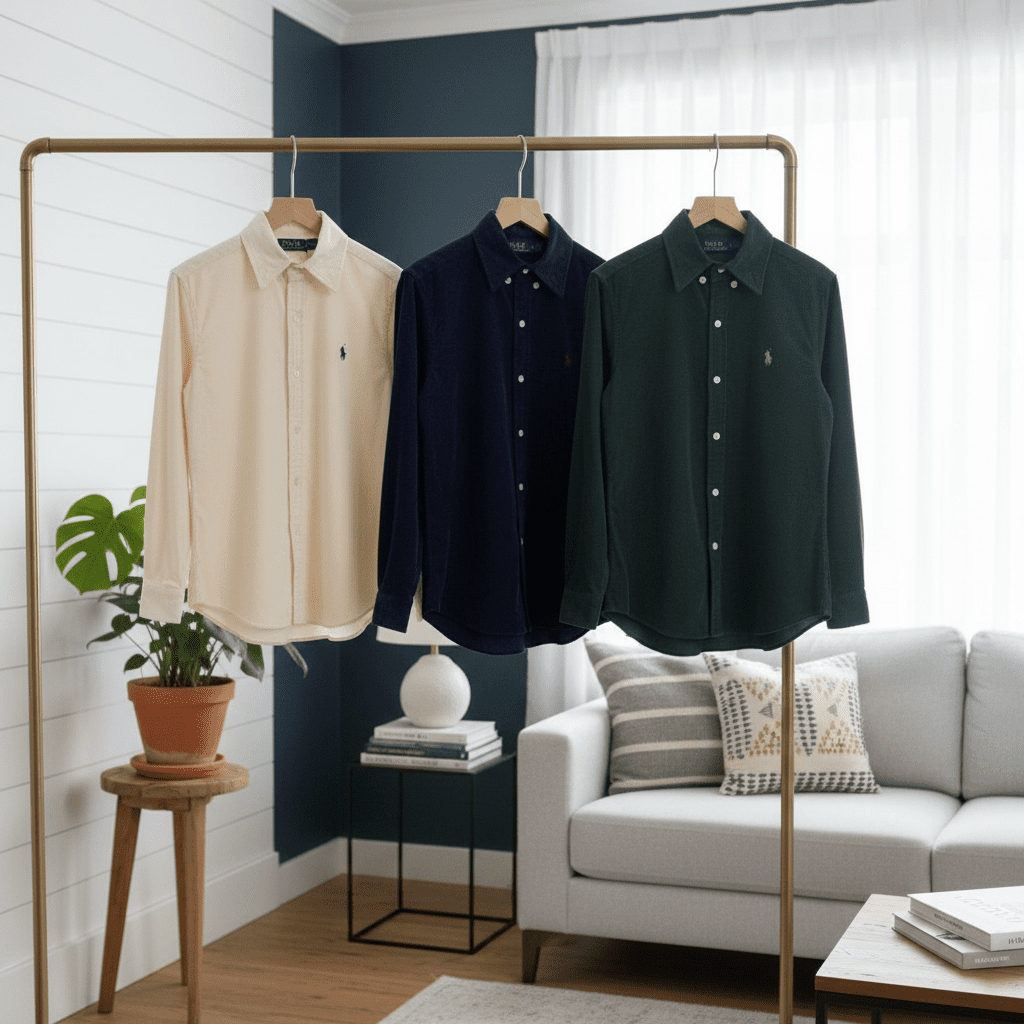 Ralph Lauren Polo Corduroy Shirt – Soft white corduroy, classic collar, signature polo embroidery on chest, unisex design for timeless American casual style, perfect for daily wear and layering.