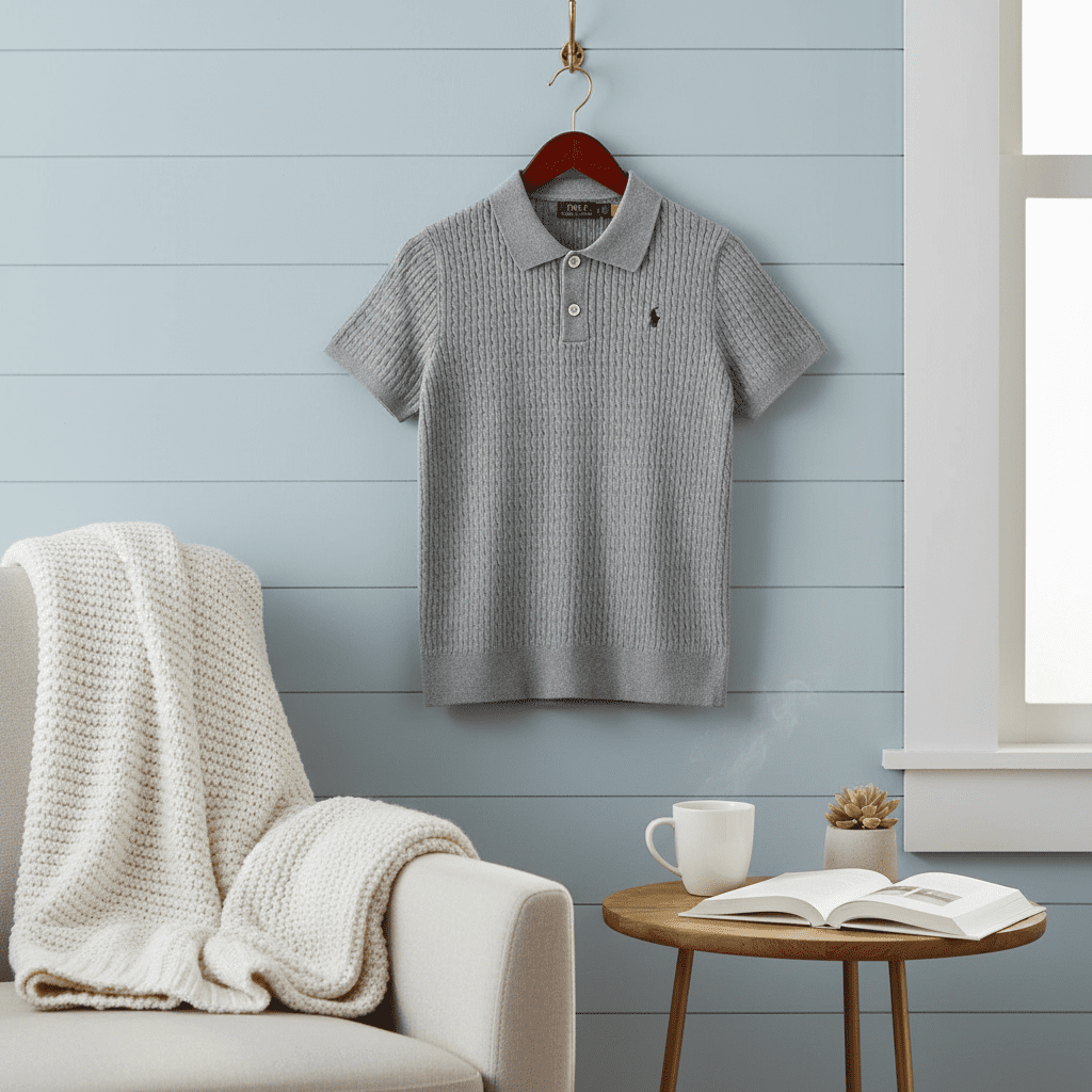 Ralph Lauren Grey Knit Polo Shirt, ribbed texture, button collar, signature pony logo, breathable and comfortable unisex design, classic American casual style perfect for daily wear.