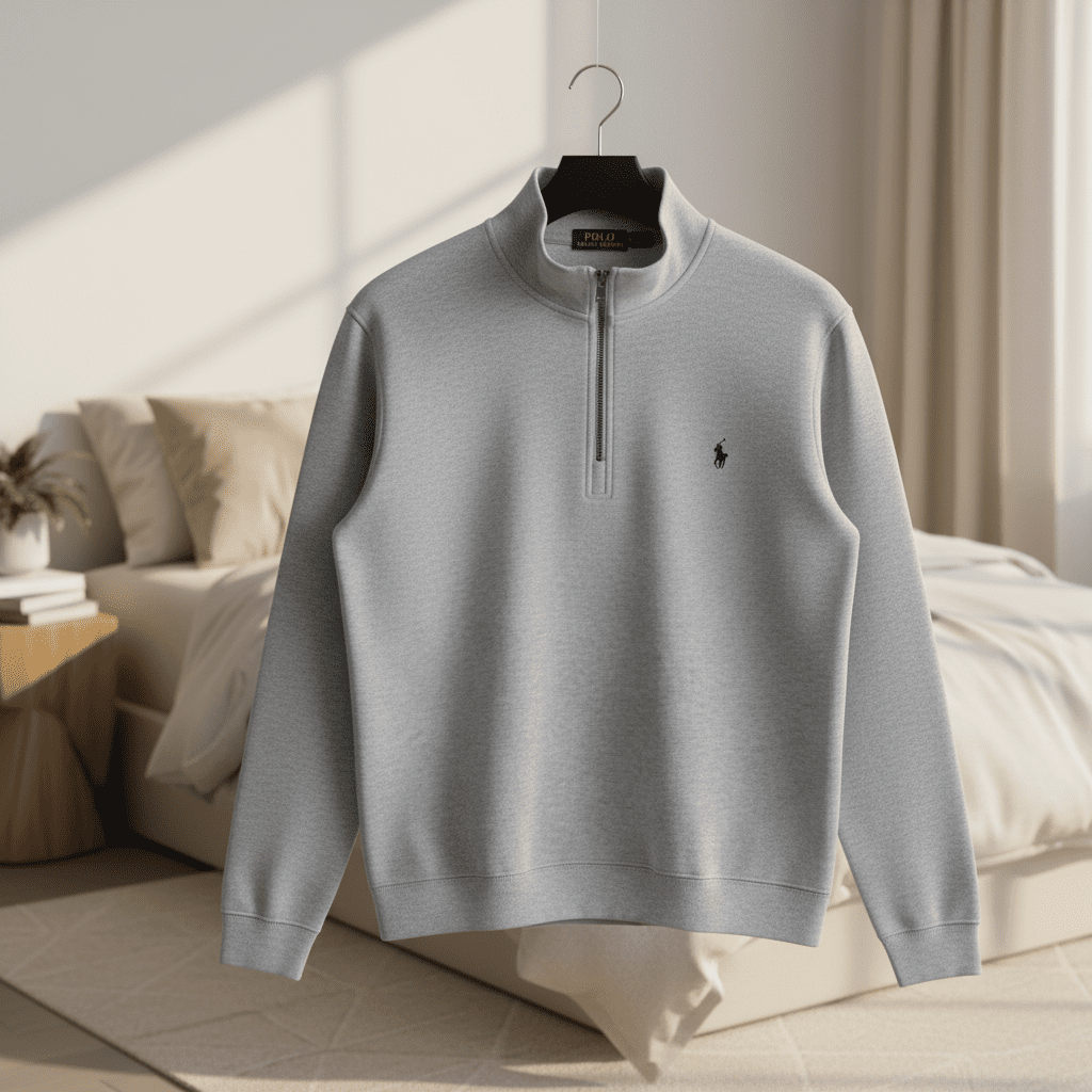 Ralph Lauren Polo Gray Half-Zip Sweatshirt, soft cotton fabric, classic chest pony logo, unisex design, stylish and comfortable American casual wear perfect for everyday outfits.