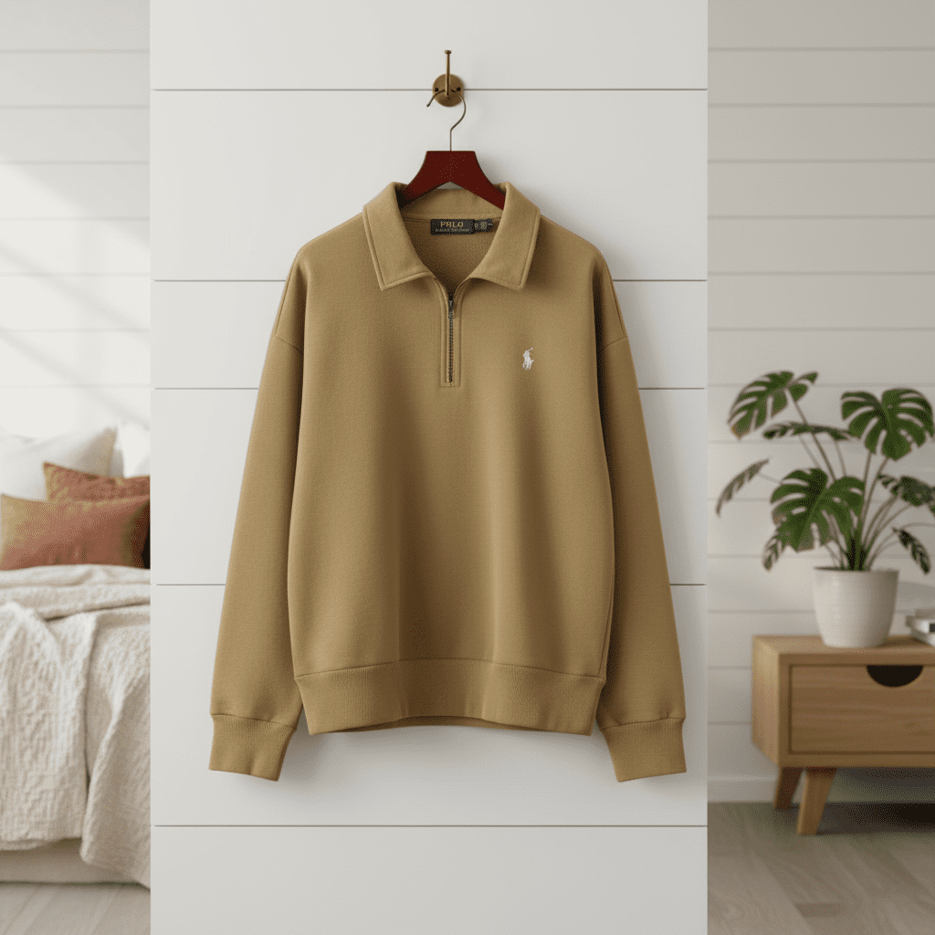 Ralph Lauren Polo Khaki Half-Zip Pullover Sweatshirt, soft breathable cotton blend, classic collar with zip detail, chest pony logo, unisex American casual style, perfect for everyday wear.