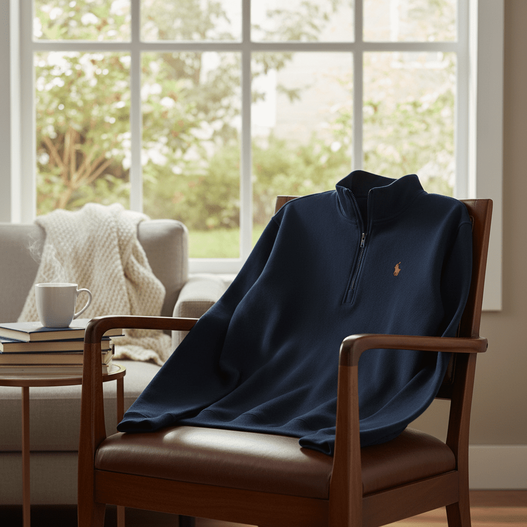 Ralph Lauren Classic POLO Half-Zip Navy Sweatshirt, soft premium cotton, red pony logo on chest, unisex casual American style, warm and versatile for everyday wear, elegant and timeless look.