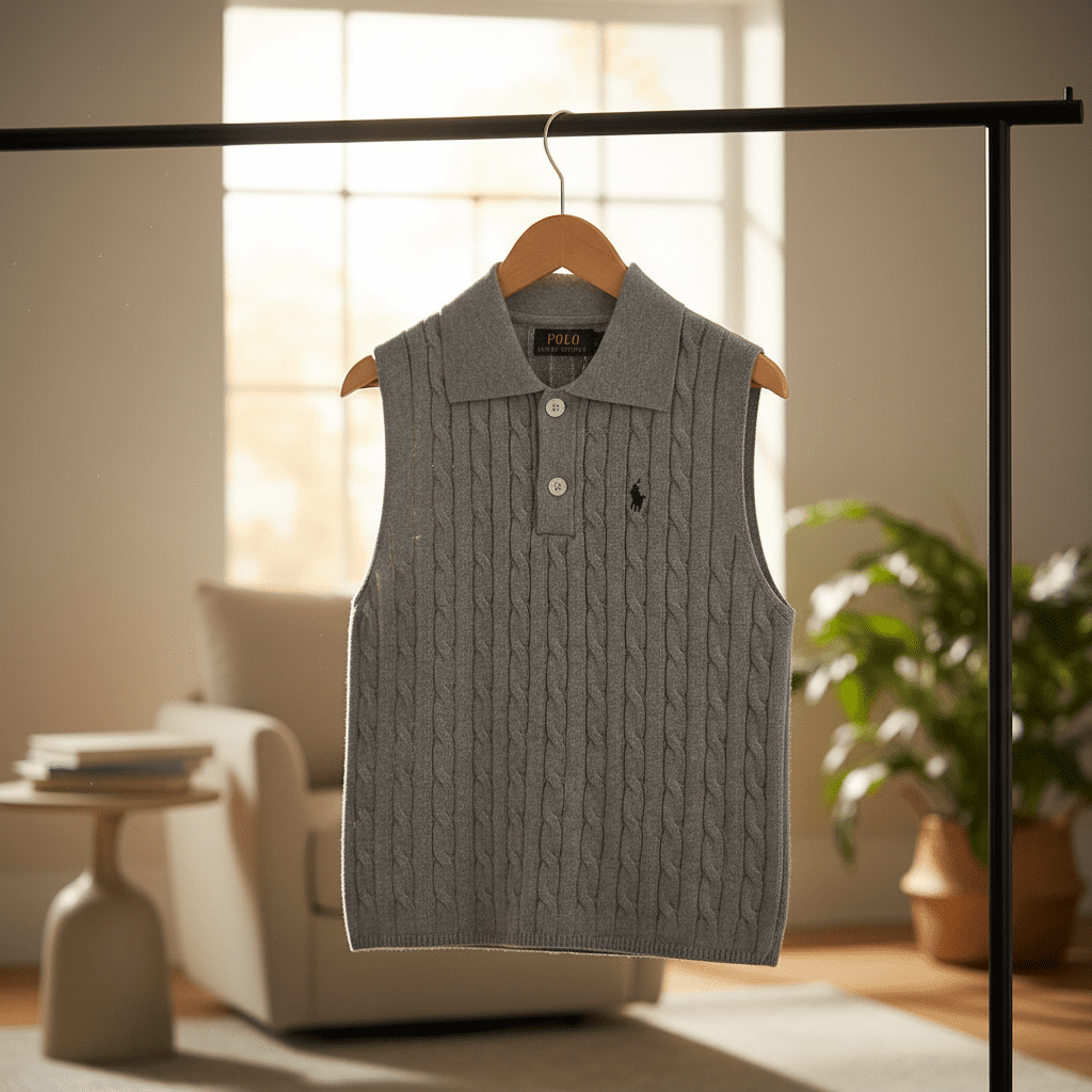 Ralph Lauren Polo Gray Sleeveless Knit Vest, cable-knit for warmth and comfort, Polo collar with button placket and blue pony logo on chest, classic American casual unisex style, perfect for daily wear.