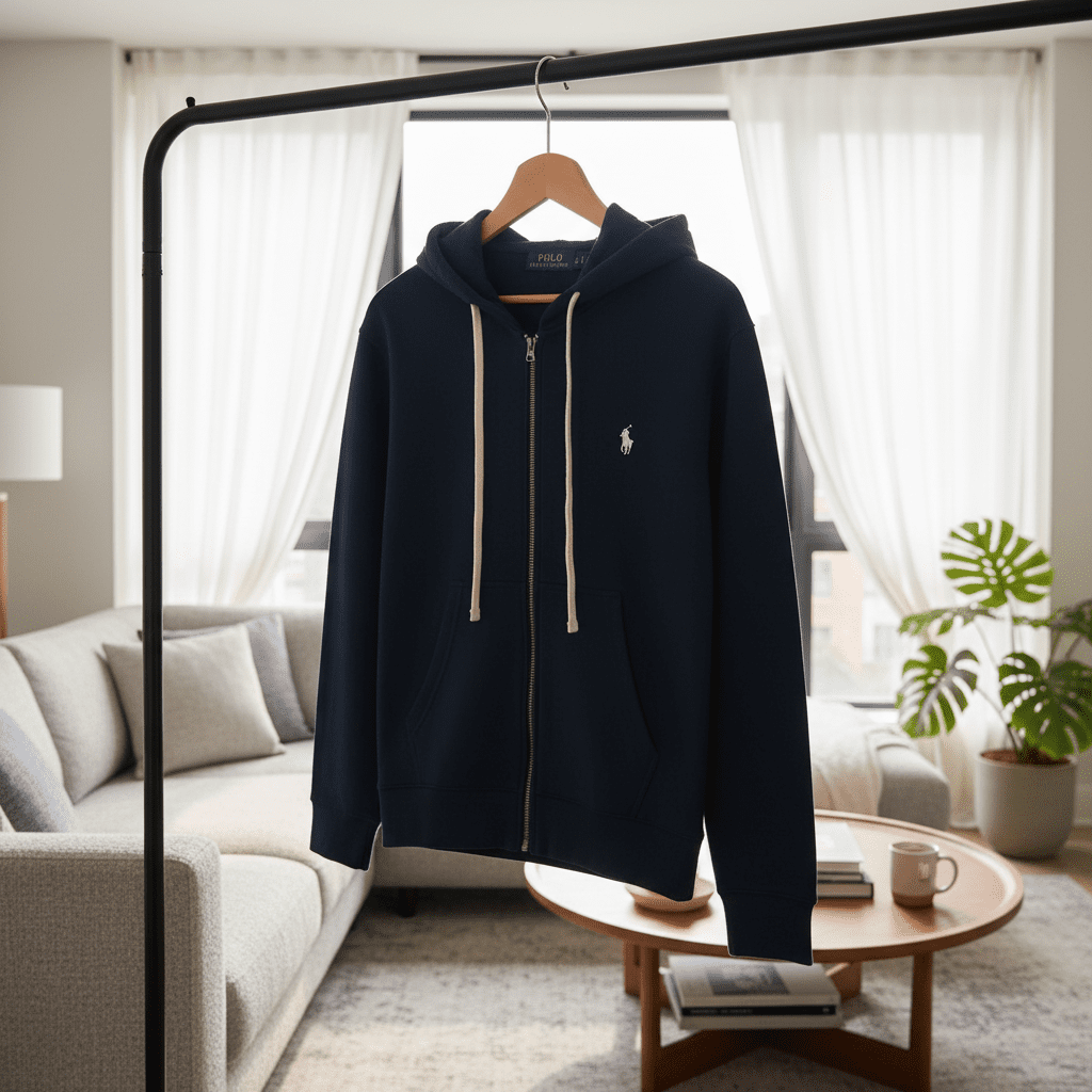 Ralph Lauren Polo Navy Hoodie, made of soft breathable cotton, zip-up front with adjustable drawstring, iconic white pony logo on chest, unisex design, perfect for casual everyday style.